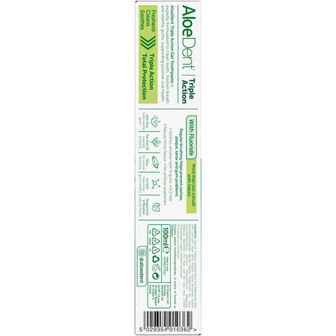 This fluoride-free toothpaste is flavoured with peppermint oil and menthol for a zingy taste and fresh breath. Use with confidence as Aloe Dent Triple Action Toothpaste contains no parabens and is SLS (sodium lauryl sulphate) free. It uses natural ingredients known for their cleansing properties.
